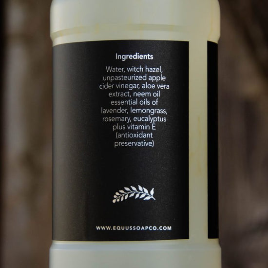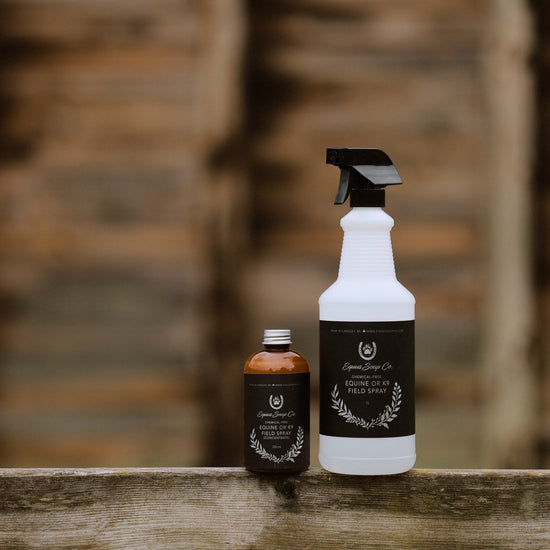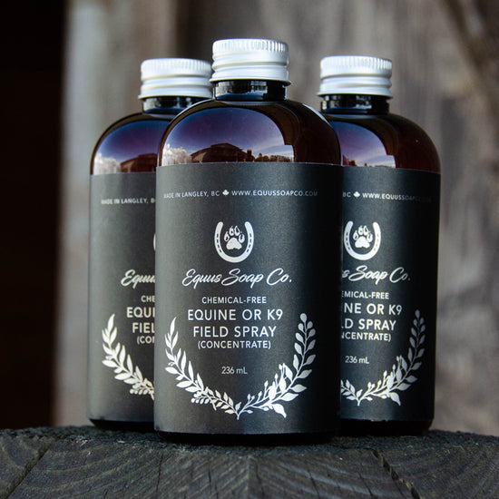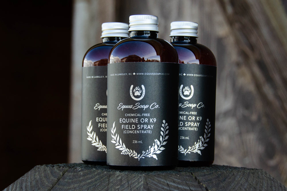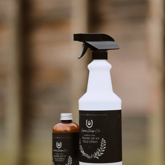 Concentrate: Just add water! Dilute 1 bottle of concentrate field spray with 750 mLs of water and pour into your favourite spray bottle. Empty Equus Soap Co. branded spray bottles can be purchased separately.