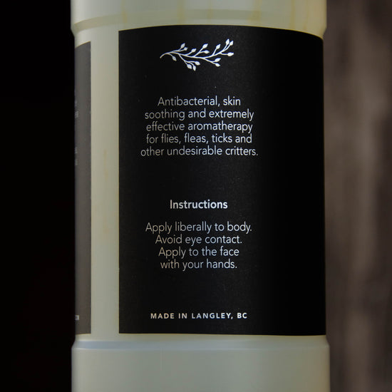 Antibacterial, skin soothing and extremely effective aromatherapy for flys, fleas, mosquitoes and other undesirable critters. Chemical-free.