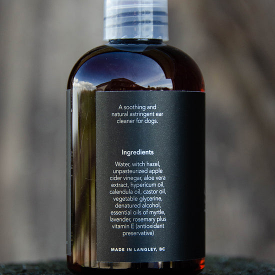 Witch hazel and aloe to sooth itch and inflammation, apple cider vinegar to balance pH and reduce yeast buildup. Calendula, hypericum oils and myrtle, lavender, rosemary essential oils have both antimicrobial and anti-inflammatory for added relief. Also useful as a general ear cleaner and after swimming to prevent microbial infections due to wet ears.